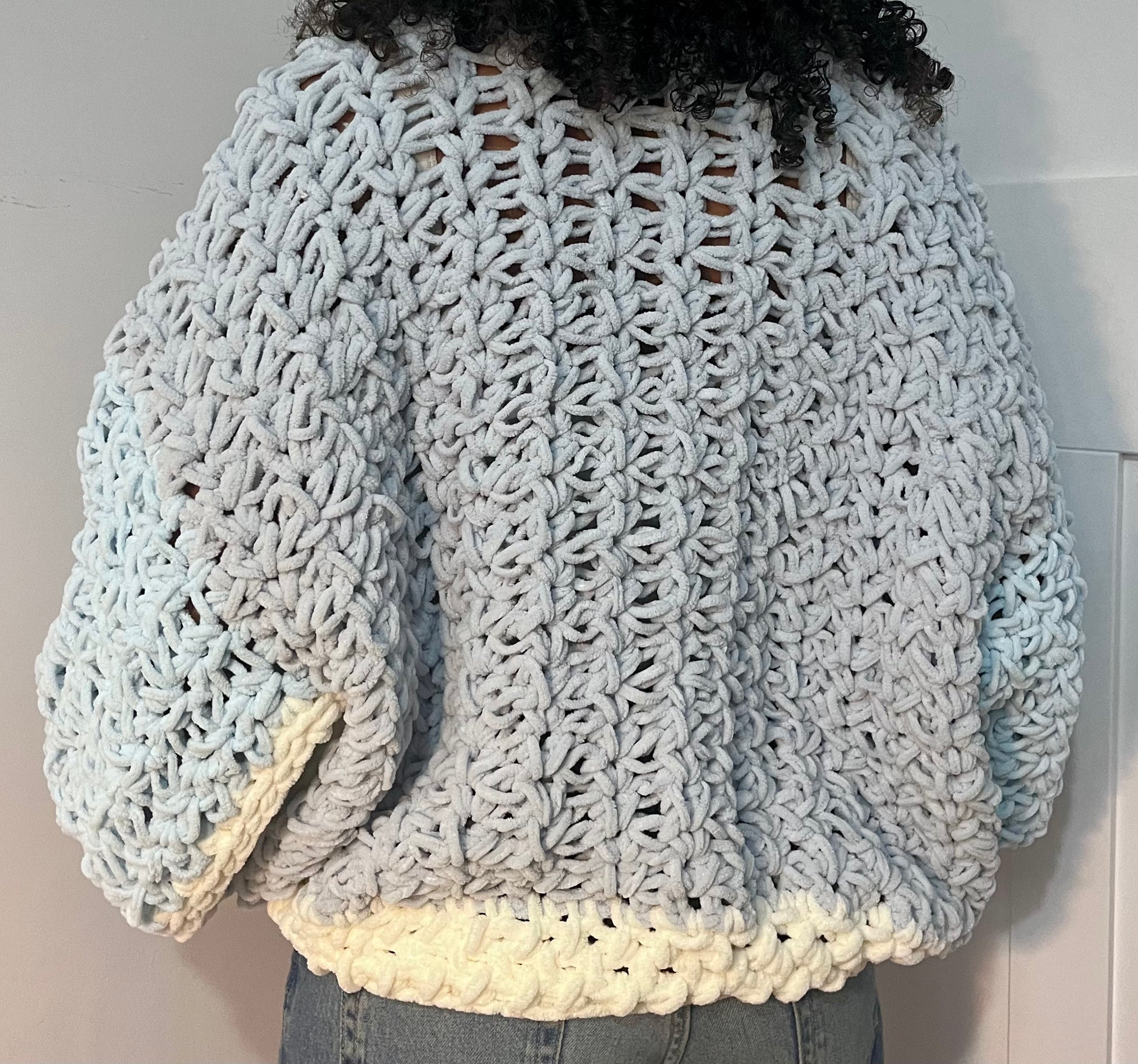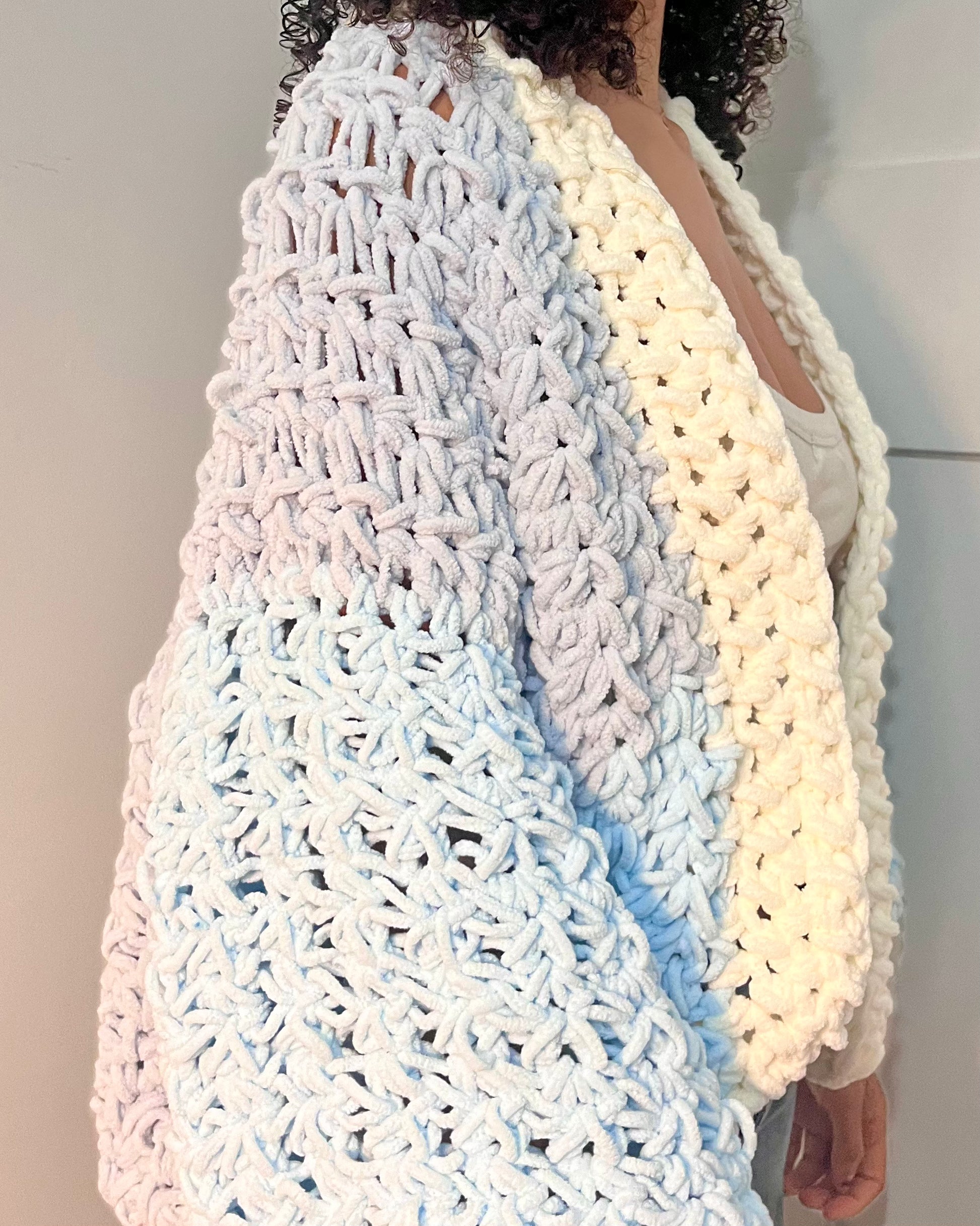 Modern long sleeve chunky cardigan created with the softest chenille yarn in a colour block of blues and cream. An open front and timeless wide sleeves, it’s perfect for any day out, paired with light jeans, a simple top and boots or flats of any kind.